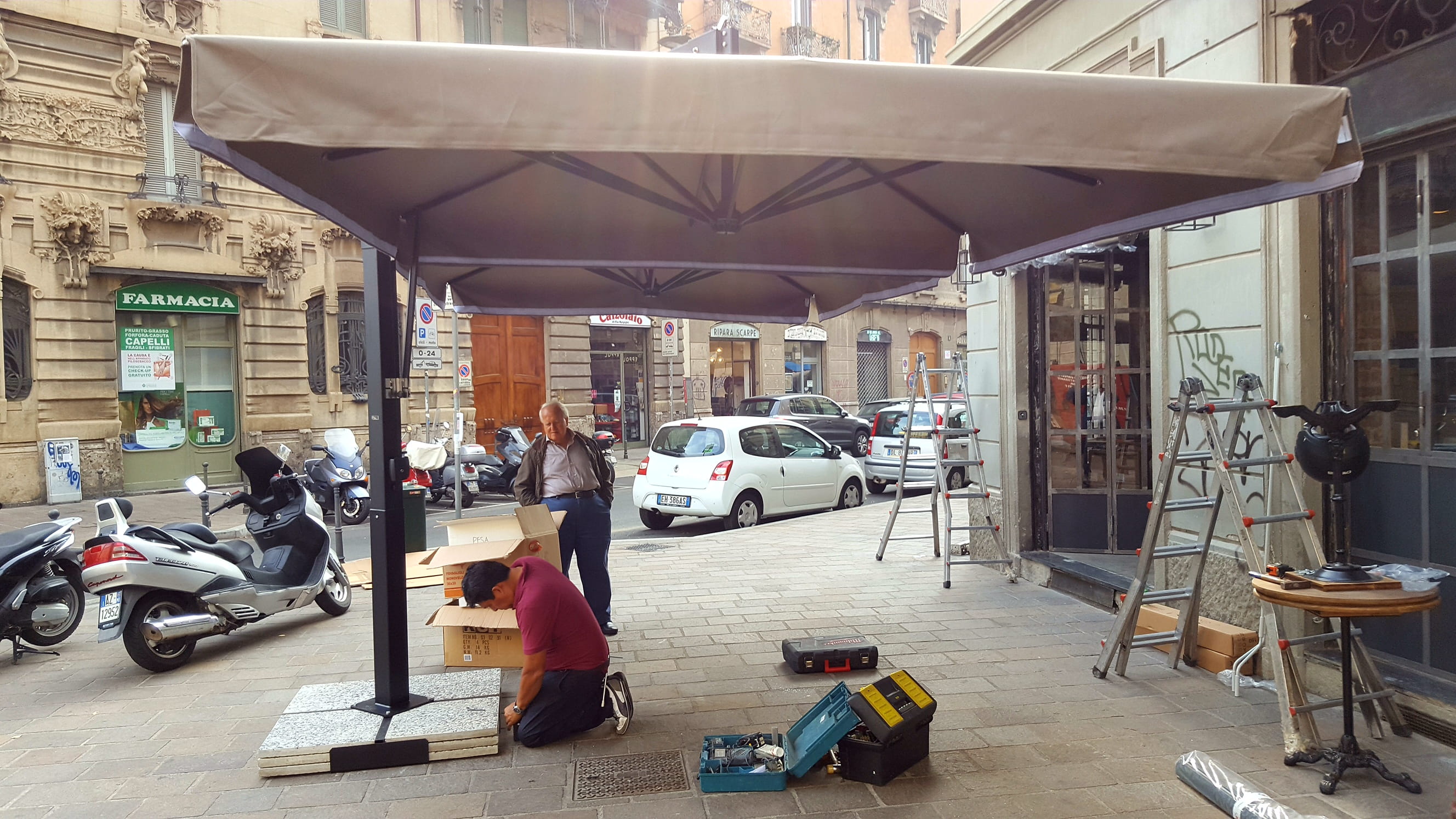 Devi liberare il suolo pubblico la sera? Forniamo basi con ruote a scomparsa o maniglie che rendono facile e veloce lo spostamento anche degli ombrelloni più grandi.