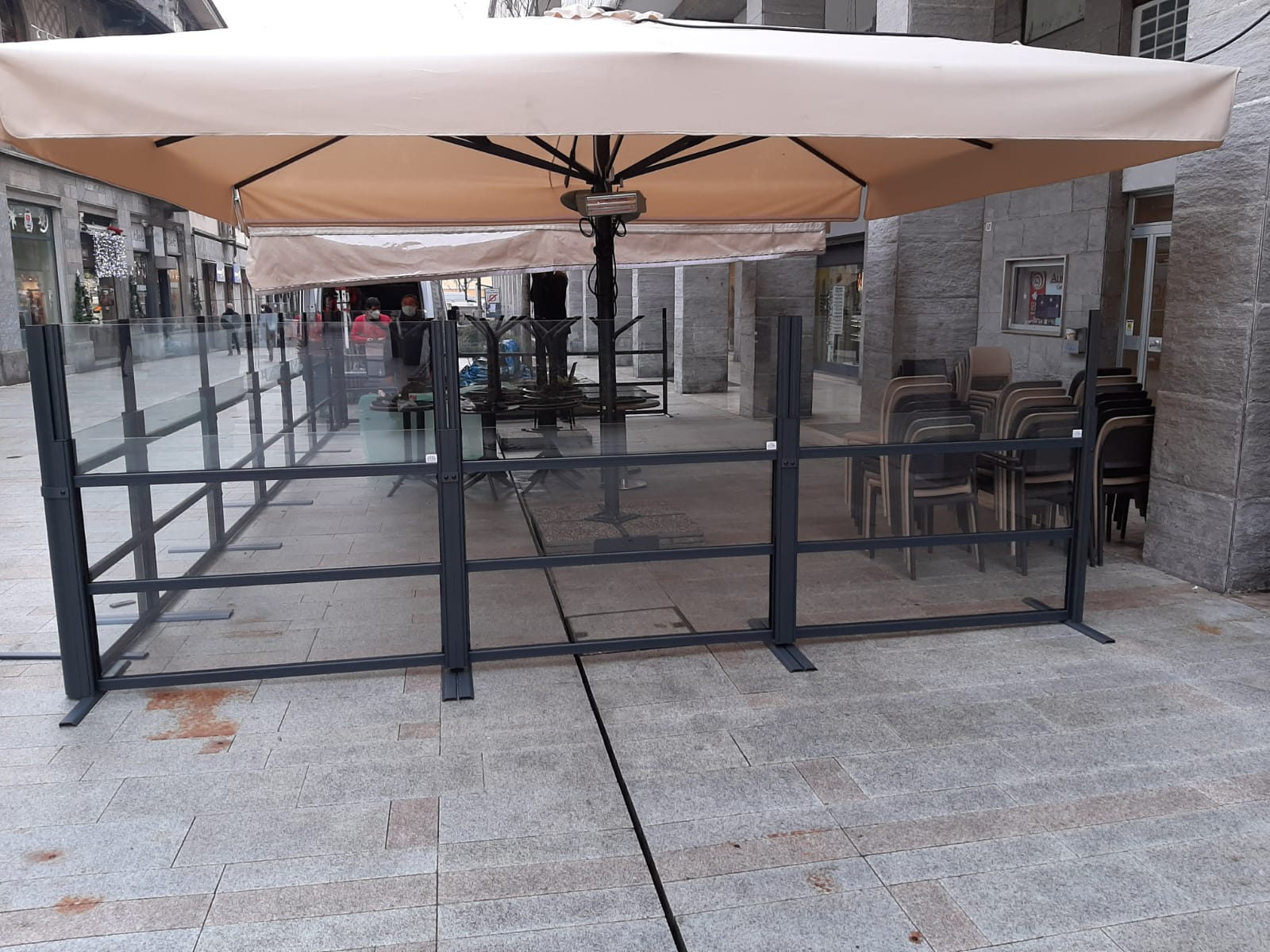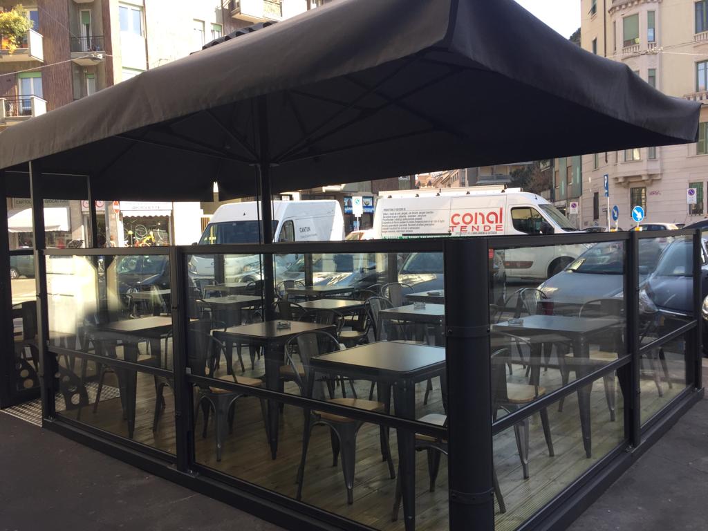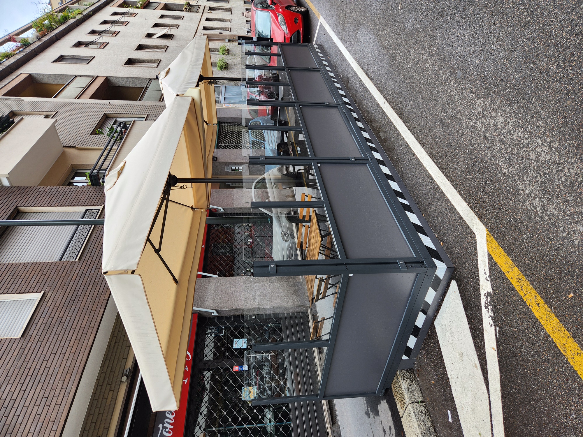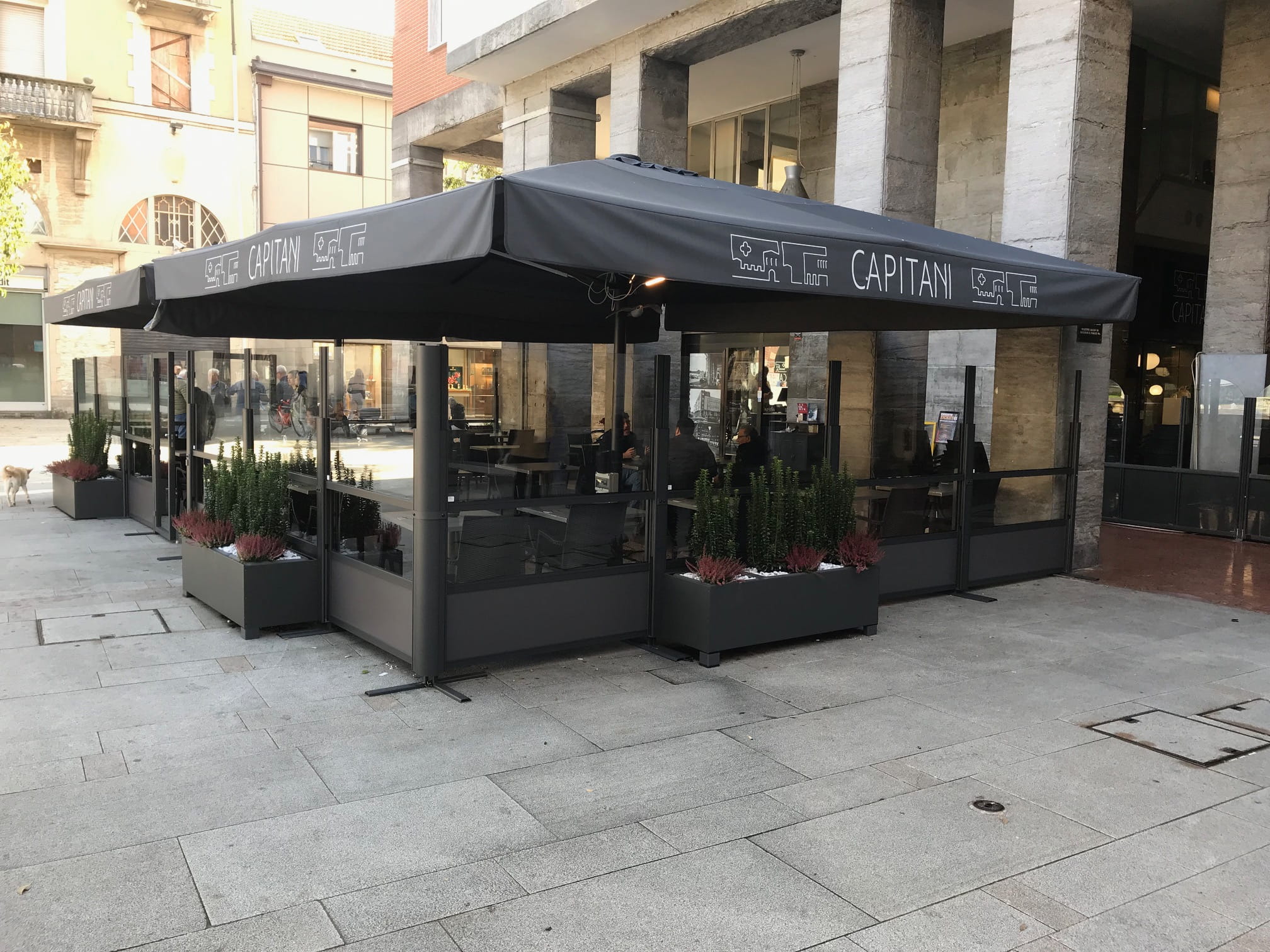 Stabilità e Branding (Palo Centrale): La scelta classica per le zone ventose. Robusto e iconico, trasforma il telo in una superficie pubblicitaria: stampiamo il tuo logo per rendere il locale visibile da ogni angolazione.