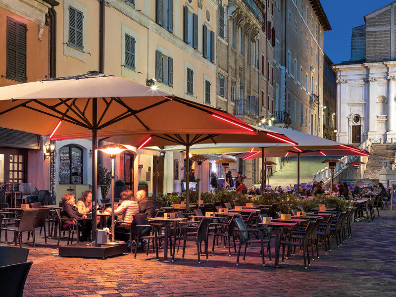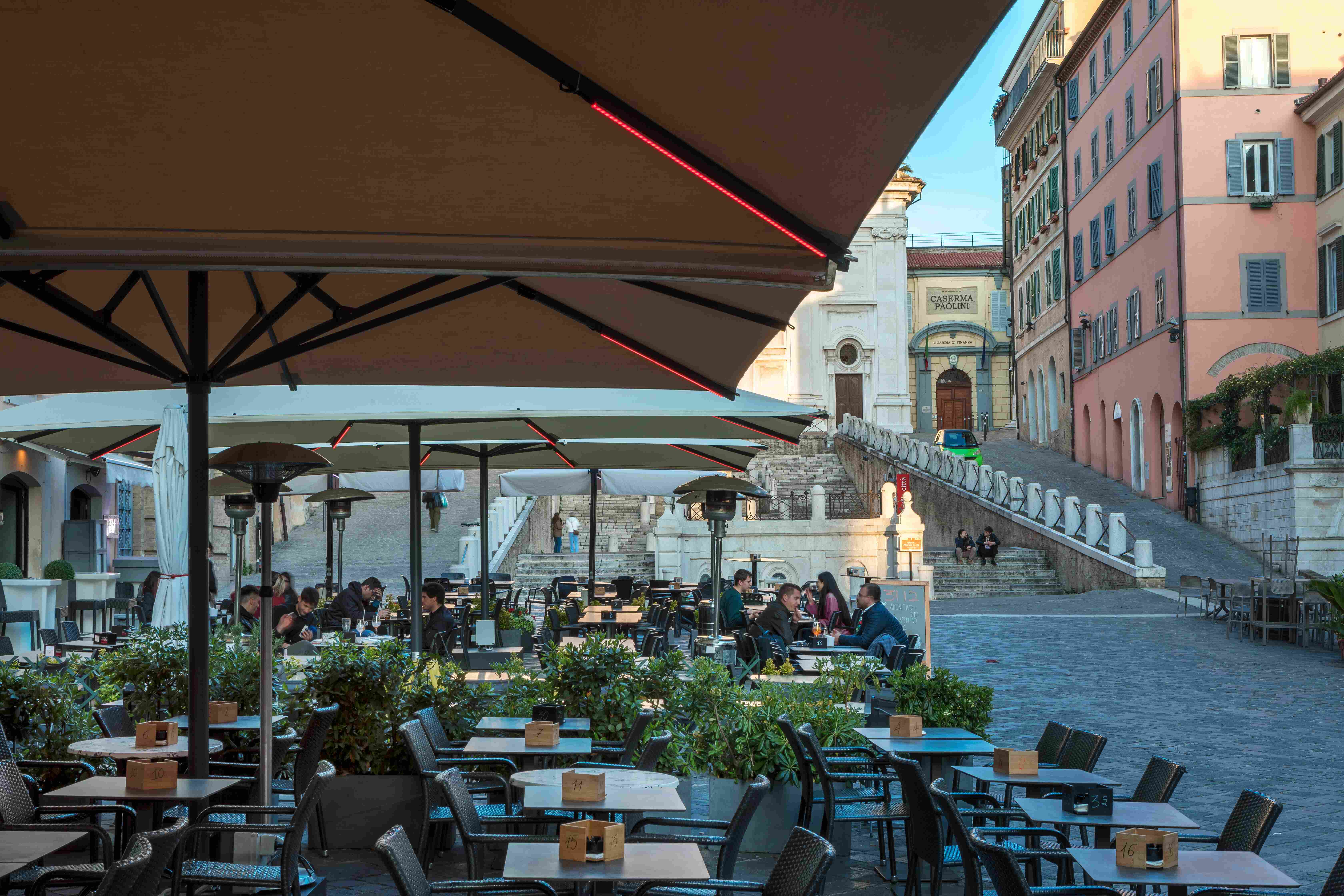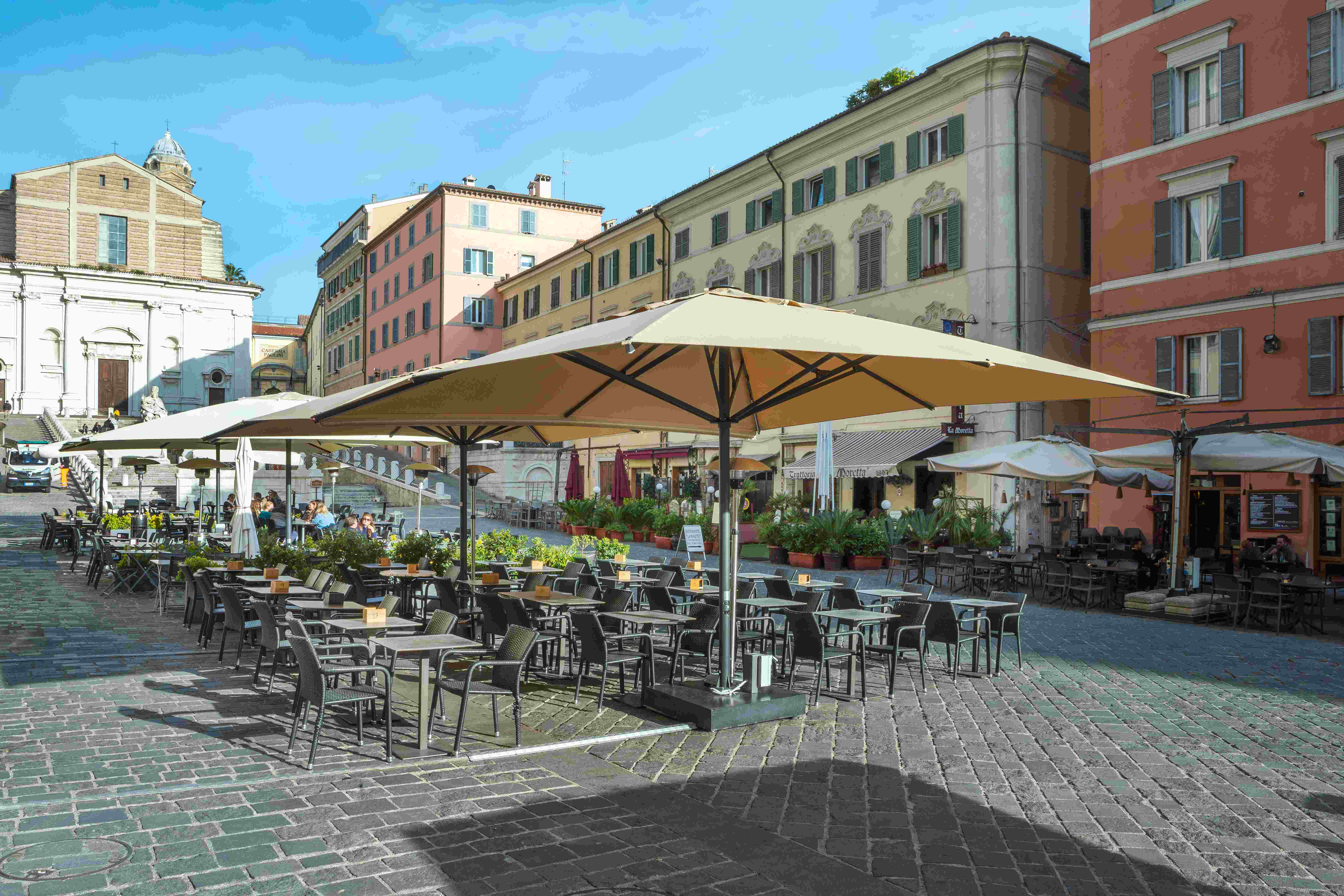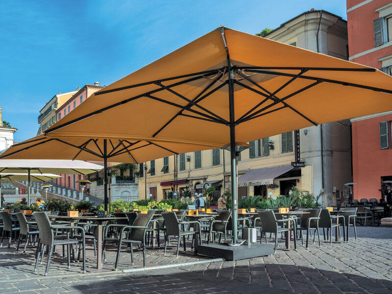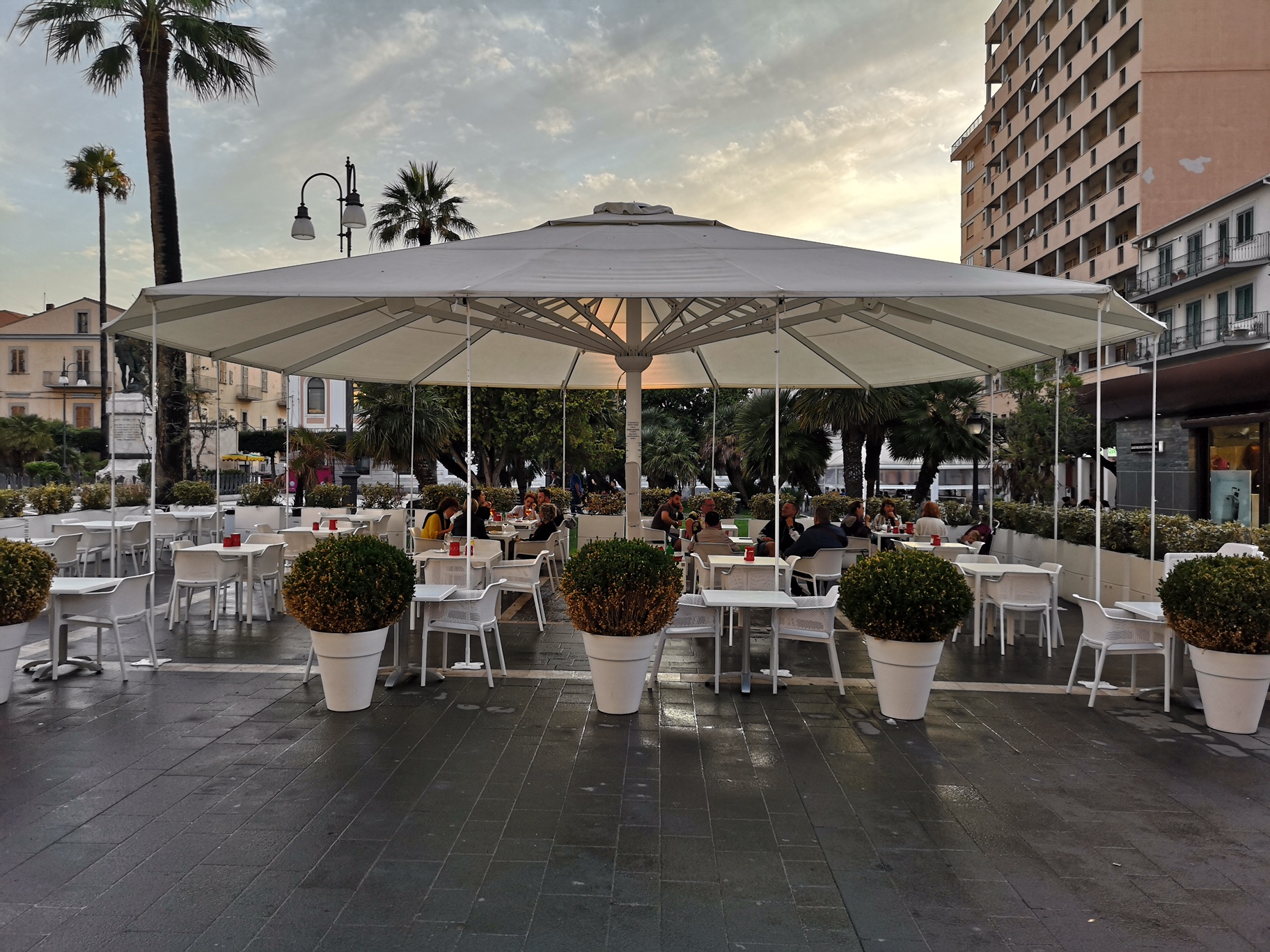 Massimizzazione dei Coperti (Palo Decentrato): Ideale per chi ha spazi stretti. Il braccio laterale elimina l’ingombro centrale, permettendoti di posizionare i tavoli liberamente e sfruttare il 100% dell’ombra senza pali tra i piedi dei clienti.