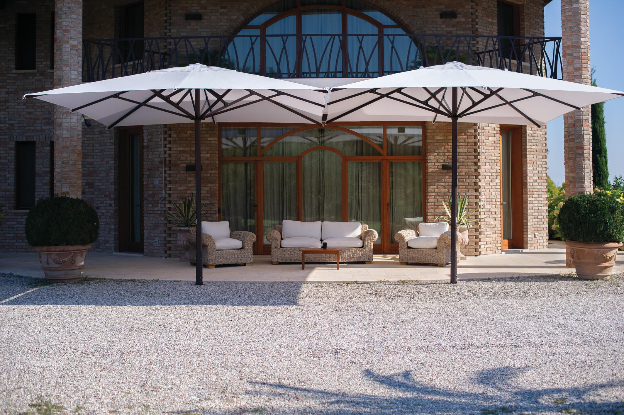 Dimentica i prodotti usa-e-getta. Le nostre strutture sono realizzate in alluminio verniciato a polveri (antracite, bianco o colori custom) o in legno trattato per esterni, garantendo durata pluriennale. La gamma spazia dagli ombrelloni giganti (fino a 9×9 metri) per grandi piazze ed eventi, ai modelli retrattili che si chiudono sopra i tavoli senza dover spostare bicchieri e arredi (chiusura telescopica). Ogni componente è sostituibile: se una stecca si rompe dopo 5 anni, la cambiamo senza dover buttare l’intera struttura.