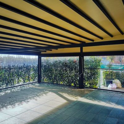 Trasforma la pergola in un giardino d'inverno. Il sistema Slide Glass (vetrate scorrevoli panoramiche) protegge da freddo e vento mantenendo la vista esterna completamente libera.