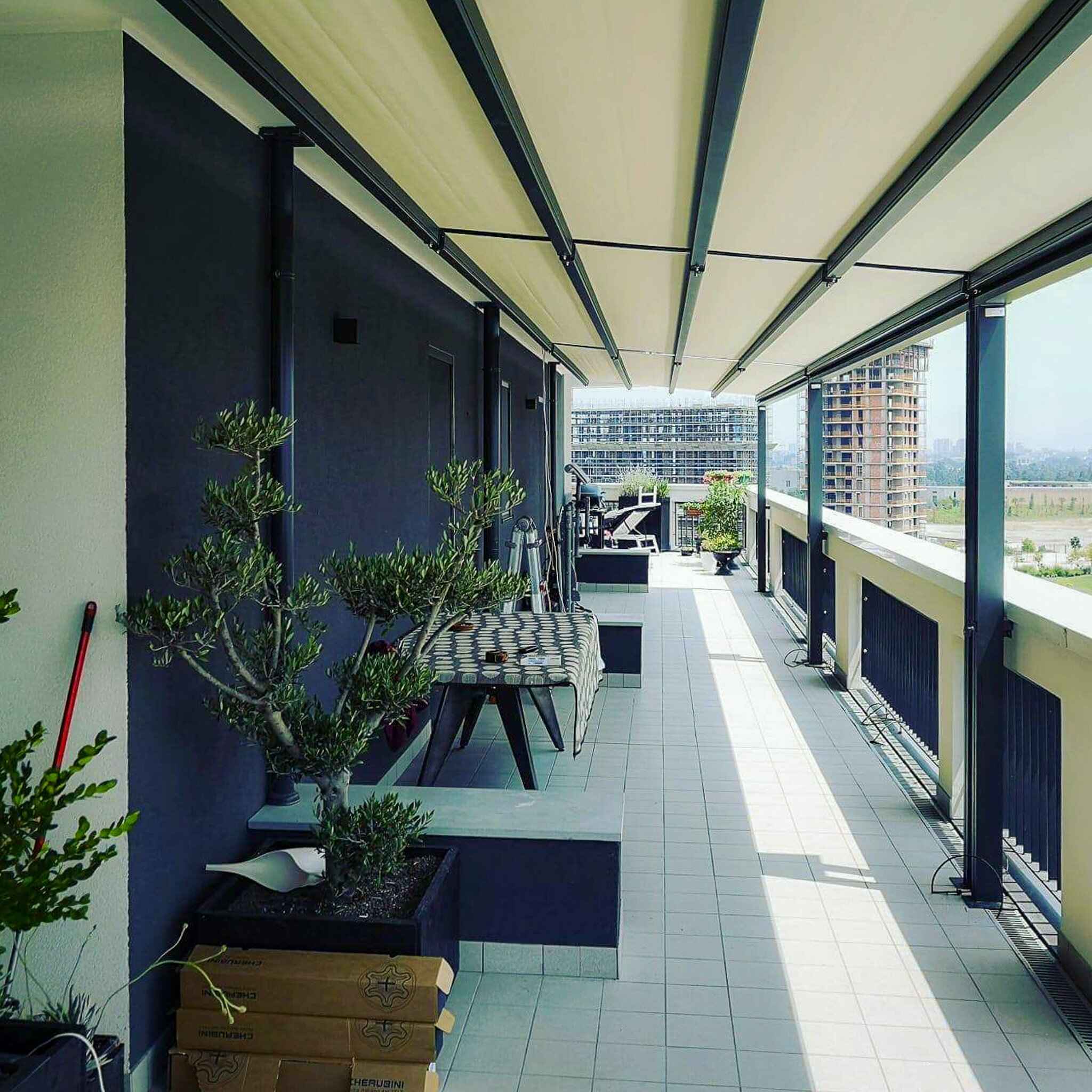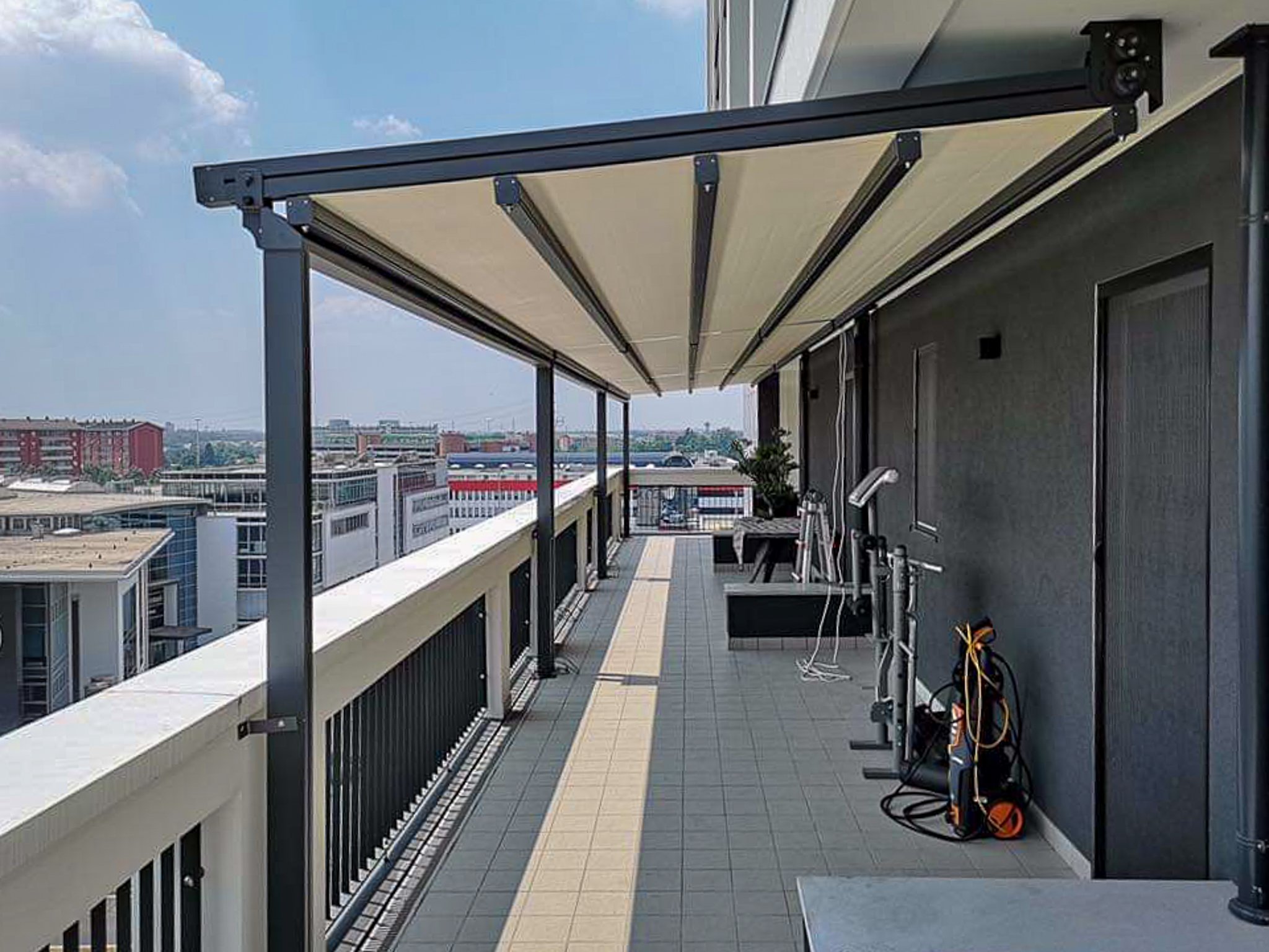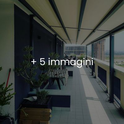 Privacy e protezione dal sole basso. Il sistema Raso (opzionale) integra tende verticali filtranti direttamente nella struttura orizzontale, scomparendo completamente quando non in uso.